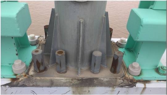 跨海大橋底座螺栓有護(hù)欄地腳螺栓、路燈柱螺栓及主航道橋護(hù)欄地腳螺栓三種類型。通常地腳螺栓采用了達(dá)克羅工藝進(jìn)行防腐處理,而鋼護(hù)欄立柱的螺栓外套為高強(qiáng)度PVC 螺栓螺母防護(hù)罩,內(nèi)部灌注黃油,從而阻止空氣和水分與螺栓螺母接觸達(dá)到防腐蝕目的。原設(shè)計(jì)防護(hù)方式經(jīng)過5年的實(shí)際應(yīng)用,由于腐蝕性環(huán)境、惡劣氣候等外部因素,大橋地腳螺栓出現(xiàn)保護(hù)罩脫落、黃油液化流失,部分地腳螺栓出現(xiàn)銹蝕等現(xiàn)象。