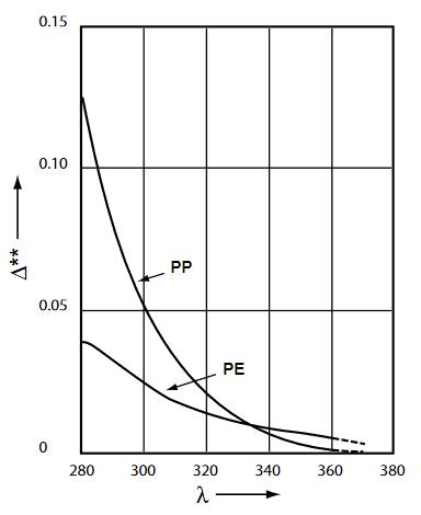 圖 2聚烯蟒的光譜響應(yīng)。羰基形成(隨光密度變化)與輻照波長的聯(lián)系,任一波長的焦耳數(shù)是1MJ/m2。