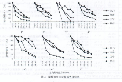 從以上數(shù)據(jù)可看到,不管是QUV加速老化試驗(yàn)還是戶外暴曬試驗(yàn),試樣的強(qiáng)力下降都很明顯。雖然這樣是很難比較兩者之間的相關(guān)性的,也很難對材料進(jìn)行篩選。但是這也可能是一種有效的產(chǎn)品研發(fā)試驗(yàn)。