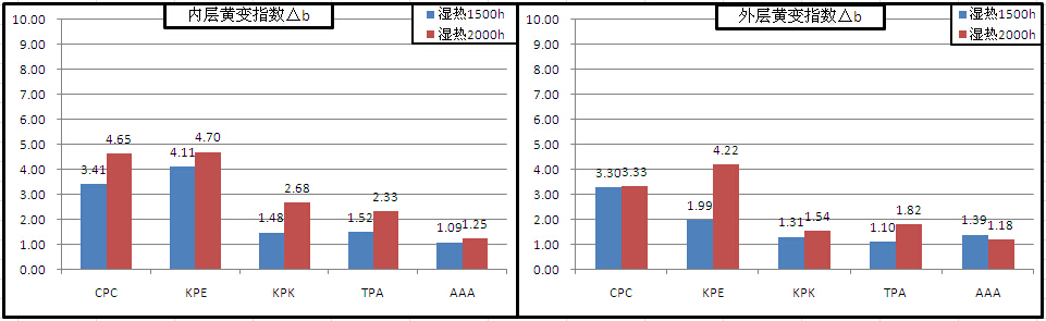濕熱老化(85度,85%濕度):在濕熱1500h后,涂覆型背板的內(nèi)層和外層,以及KPE背板的內(nèi)層E層,即已發(fā)生不同程度的黃變(如圖1)。至濕熱2000h時(shí),多數(shù)背板的內(nèi)層及外層黃變程度均有加深,尤其是涂覆型背板的內(nèi)層,以及KPE背板內(nèi)層E層。TPA背板的內(nèi)層A層及AAA背板內(nèi)外層在濕熱老化過(guò)程中有輕微黃變(不明顯);個(gè)別PVDF膜表現(xiàn)較差,如試驗(yàn)中的背板KPE的外層PVDF,在濕熱老化至2000h時(shí),也發(fā)生了明顯黃變;而特能® (Tedlar®)膜,在濕熱老化過(guò)程中無(wú)明顯黃變現(xiàn)象??傮w而言,濕熱老化過(guò)程中,涂覆型背板的涂層(尤其是內(nèi)層涂層)較氟膜PVDF膜和特能® (Tedlar®)膜,以及AAA(聚酰胺)更容易發(fā)生黃變。