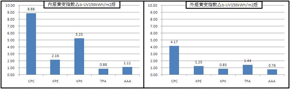 UV150kWh/m2(60℃-試驗(yàn)箱內(nèi)空氣溫度,輻照度45W/m2):UV試驗(yàn)時(shí),背板外層對(duì)著紫外燈。在UV150kWh/m2后(圖2),涂覆型背板的內(nèi)層和外層均發(fā)生了顯著黃變;個(gè)別PVDF膜,如試驗(yàn)的KPK背板的內(nèi)層PVDF層,也發(fā)生了顯著黃變;而特能® (Tedlar®)膜和較好的PVDF膜,無(wú)明顯黃變;KPE內(nèi)層E層及AAA背板,也無(wú)明顯黃變。之所以背板外層對(duì)著紫外燈,而背板內(nèi)層仍然發(fā)生黃變,是由于試驗(yàn)箱中,紫外燈燈管沿箱子一側(cè)的箱壁從上之下依次裝配,背板材料只能也采取外層面向紫外燈管從上至下依次懸掛放置,而背板另一側(cè)的箱壁(不銹鋼制作)會(huì)不可避免反射紫外線至背板的內(nèi)層,如此造成背板內(nèi)層黃變現(xiàn)象的發(fā)生。總體而言,加強(qiáng)UV輻照下,涂覆型背板的涂層和一些PVDF膜,容易發(fā)生黃變,特能® (Tedlar®)膜則表現(xiàn)較好。