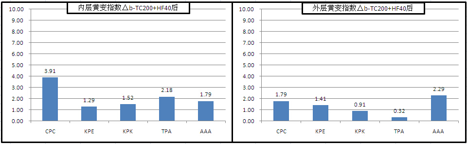 TC200+HF40:經(jīng)過(guò)TC200+HF40擴(kuò)展序列測(cè)試后(圖3),涂覆型背板的內(nèi)層發(fā)生了比較明顯的黃變,而外層涂層黃變程度相對(duì)較輕,但△b仍接近2;復(fù)合型背板,無(wú)論是氟膜PVDF或特能® (Tedlar®),還是內(nèi)層E層,均無(wú)明顯黃變;而TPA的A層,以及AAA的外層,均發(fā)生了輕微的黃變(不明顯)??傮w而言,擴(kuò)展的高低溫序列測(cè)試,只有涂覆型背板的內(nèi)涂層發(fā)生了一定程度的黃變。